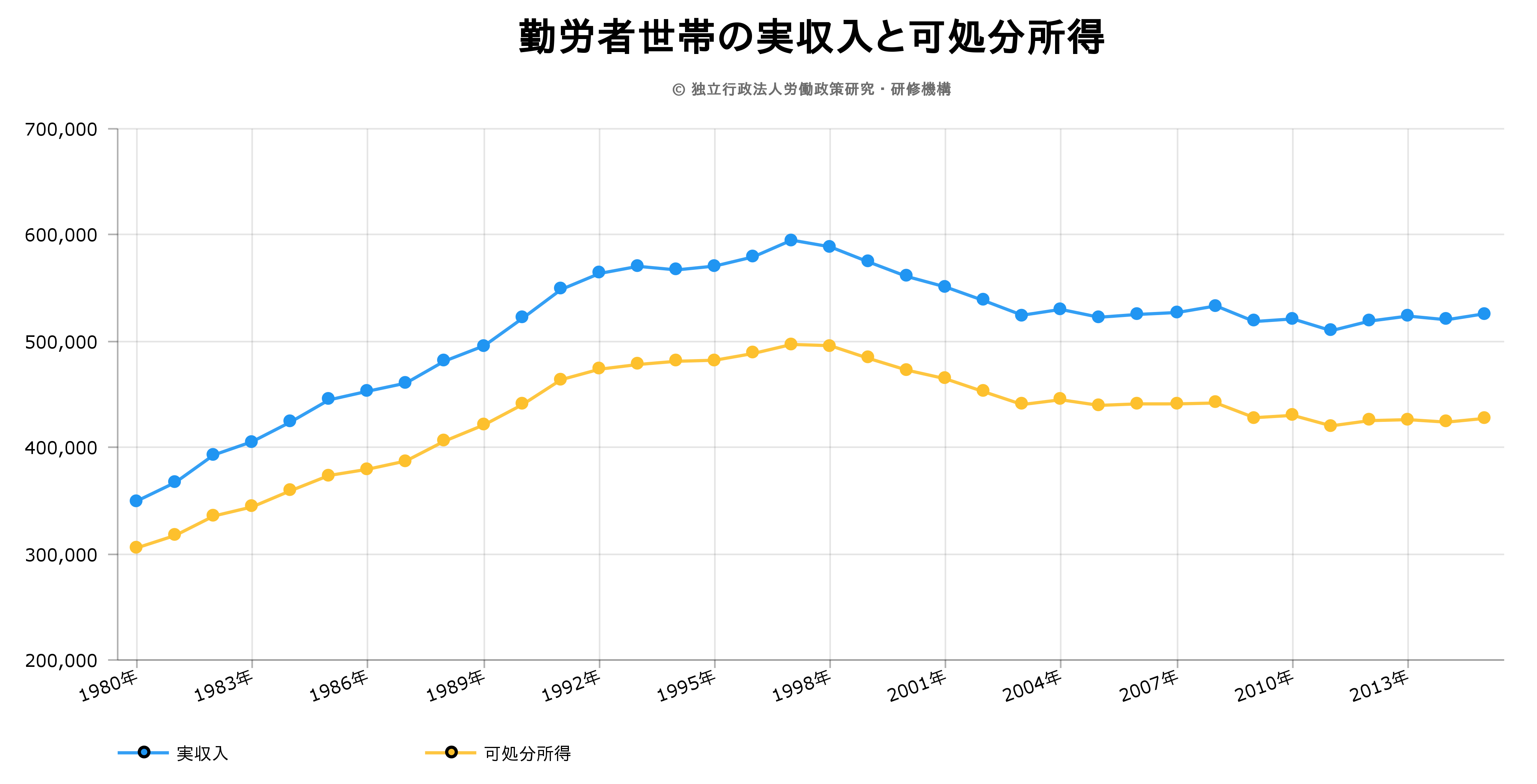 勤労者世帯の実収入と可処分所得