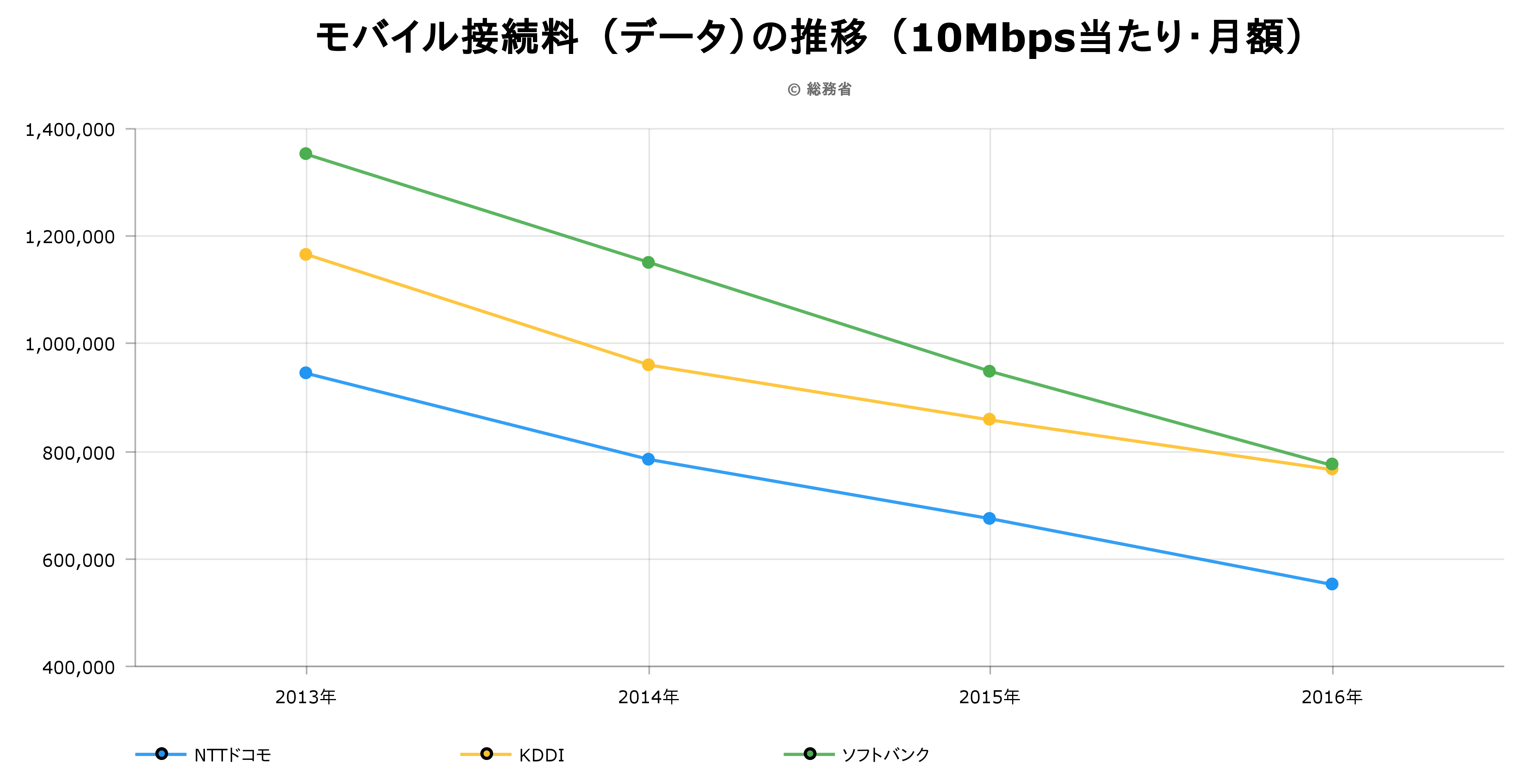 モバイル接続料(データ)の推移(10Mbps当たり・月額)