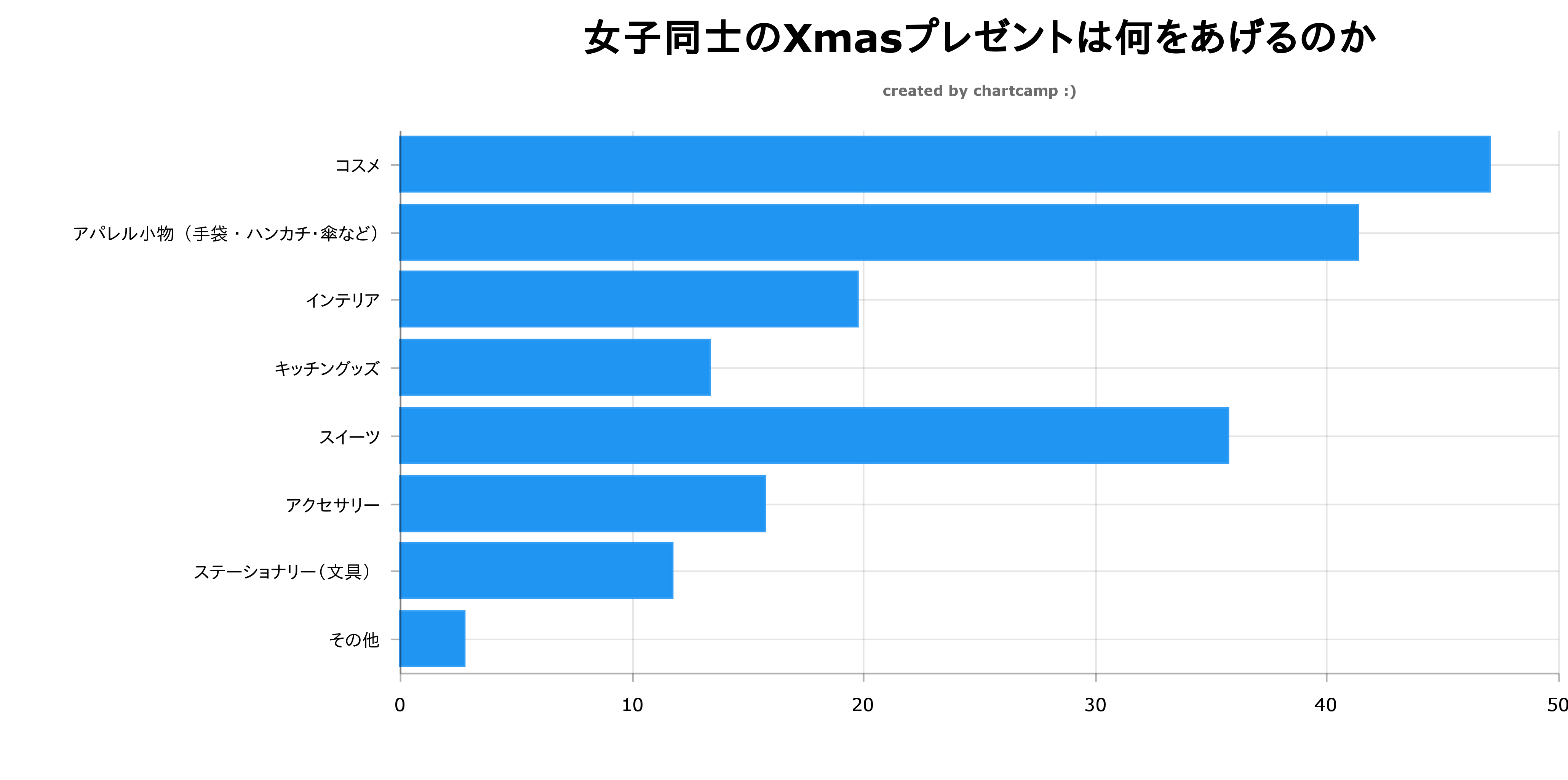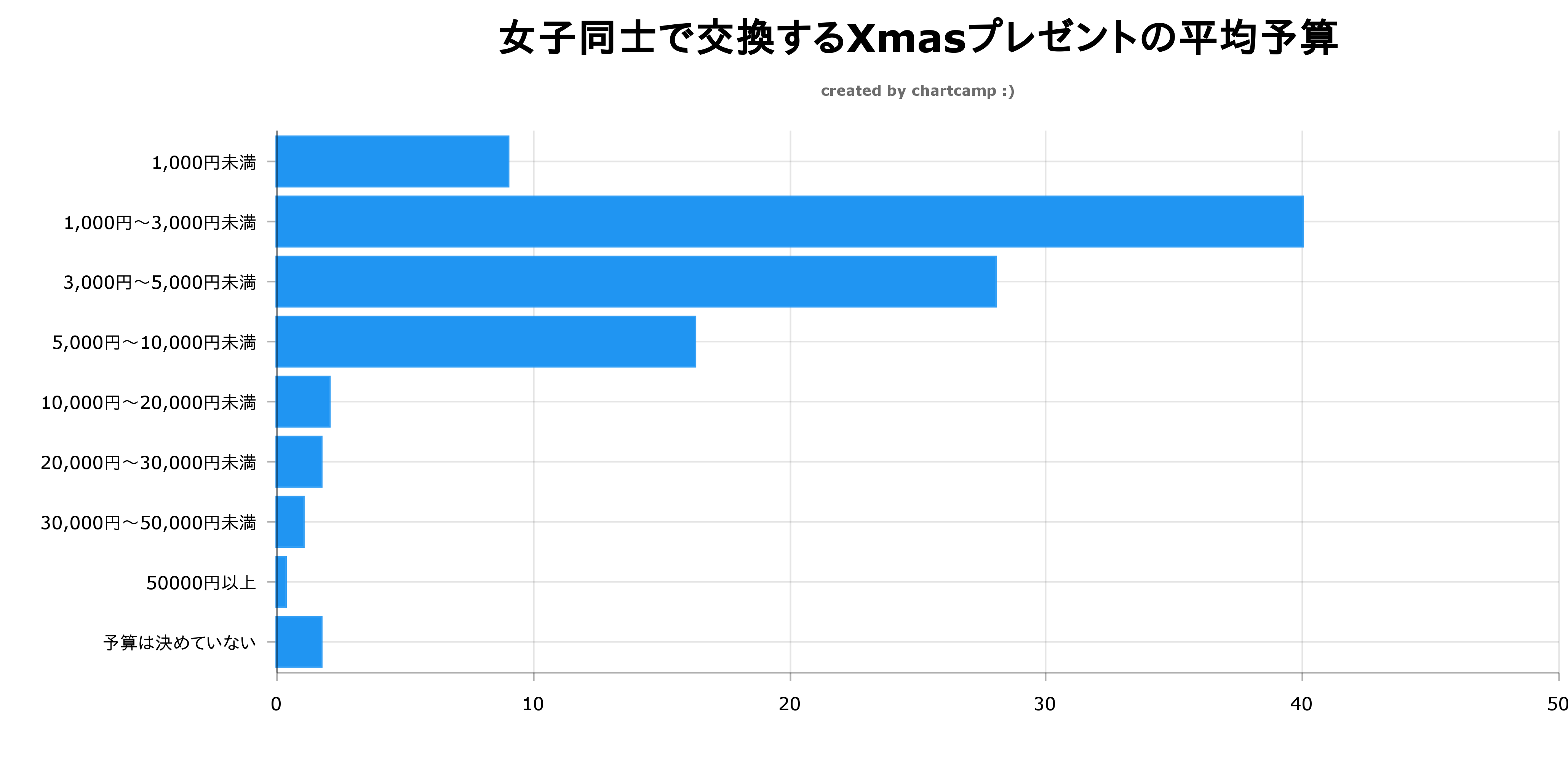 【質問内容】 女子同士で交換するクリスマスプレゼントの1個あたりの平均予算を教えてください(単数回答) 【調査概要】 1....