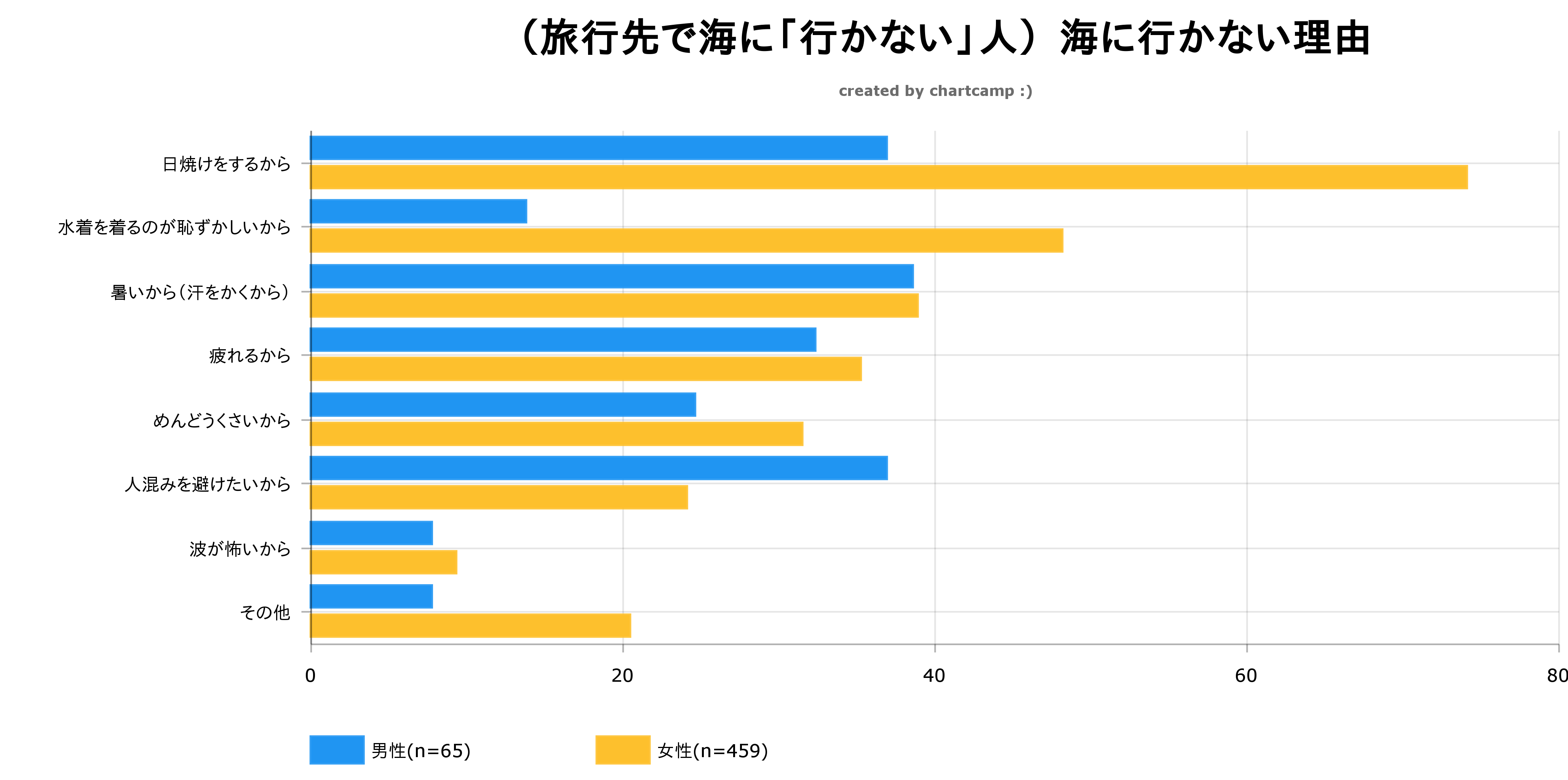 (旅行先で海に「行かない」人)海に行かない理由は何ですか?【複数回答可】 【調査概要】 調査タイトル:「海での過ごし方」に関するアンケート調査 調査対象: 10代~70代の男女1037名...