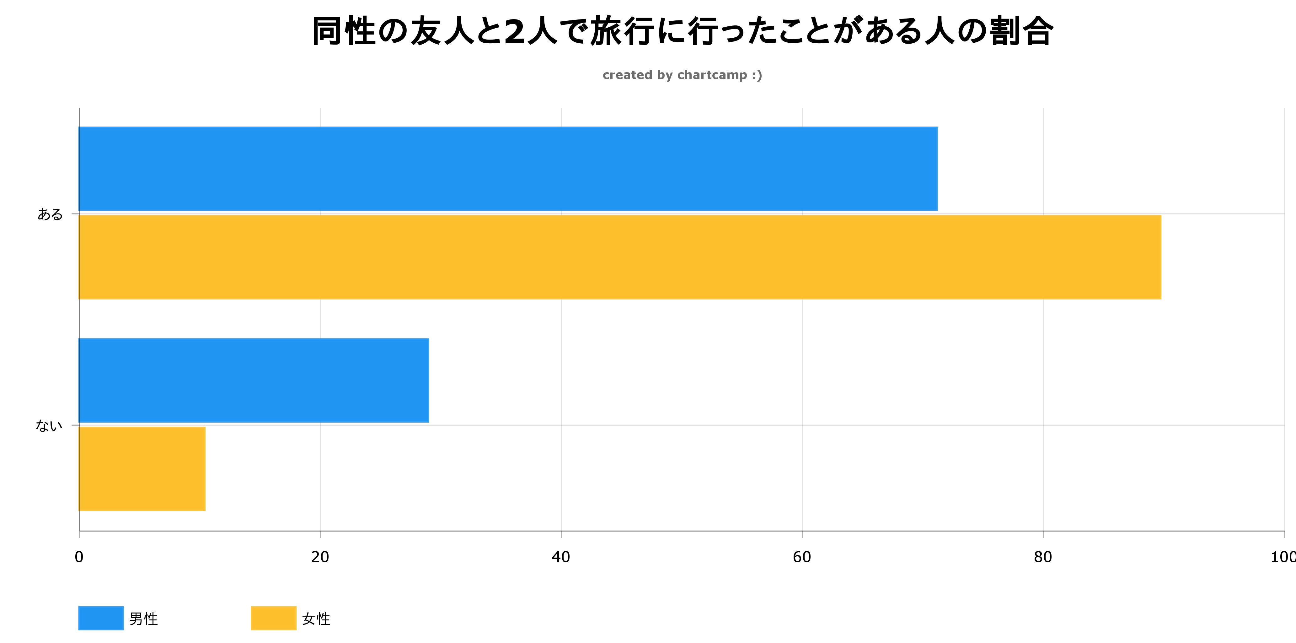同性の友人と2人で旅行に行ったことがありますか?回答数=1837 【調査概要】 調査タイトル:「同性2人旅」に関するアンケート調査 調査対象: 10代~70代の男女1837名...